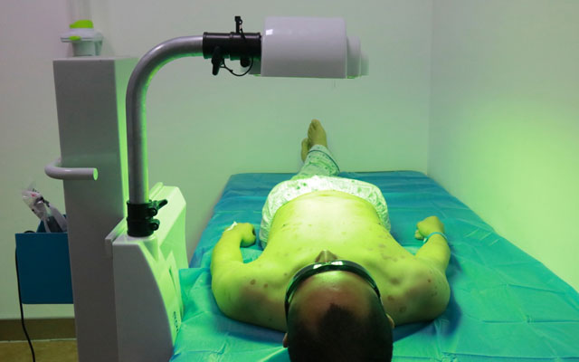 我院特从韩国引进的V-DⅢ光动力治疗仪,利用波长为290-320nm的中波宽谱紫外线(BB-UVB),作用于皮肤中7-脱氢胆固醇,形成维生素D3,可抑制免疫反应,使身体重获维生素D3自我生成的能力,这一点是通过药物和食物补充无法达到的效果。同时,紫外线照射可使角质形成细胞形成多种白介素和肿瘤坏死因子,参与免疫细胞激活、分化、增殖。随着照射使免疫球蛋白形成增多,增加补体活性和网状内皮细胞的吞噬能力,改变T细胞亚群成分等。而皮肤基底层的黑素细胞吸收紫外线后产生更多的黑素颗粒并输送到角质形成细胞中,可增强皮肤的屏障作用,对皮肤表面具有杀菌作用,可谓多效合一。